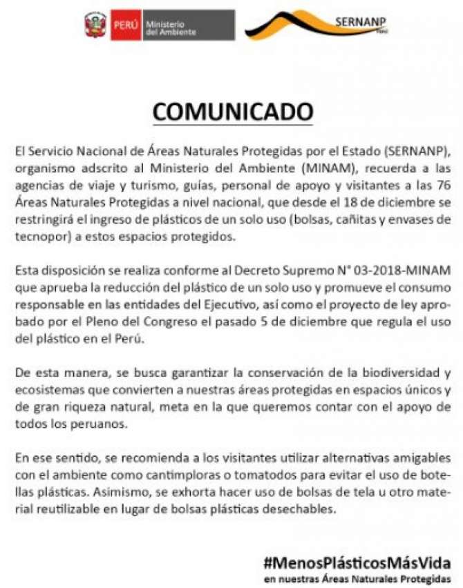 Desde mañana, se restringirá el ingreso de plásticos de un solo uso (bolsas, cañitas y envases tecnopor) a las áreas protegidas del país,