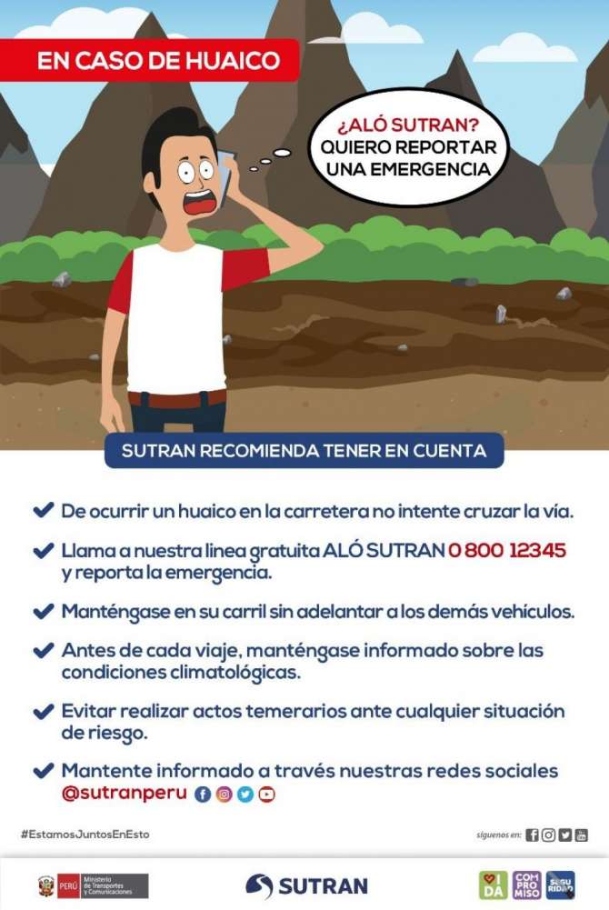 “En caso de ocurrir un huaico mientras conduce por la carretera no intente cruzar la vía, ni realice actos temerarios que pongan en peligro su vida o la de las personas que traslada. De presentarse lluvias intensas evite estacionarse debajo de árboles, anuncios publicitarios o líneas eléctricas. Mientras llueva reduzca la velocidad y encienda las luces para ser visualizado por los otros vehículos”, señaló la Sutran en un comunicado.