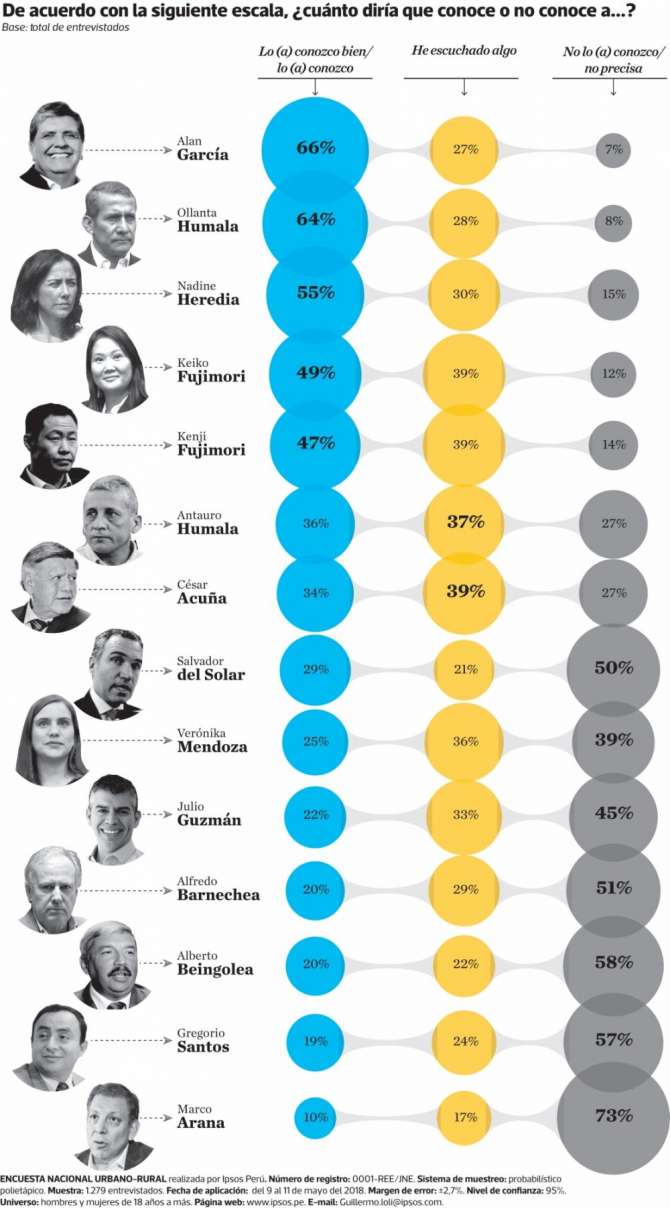 La última encuesta nacional urbano-rural de El Comercio-Ipsos midió el nivel de conocimiento que tiene la población sobre algunos líderes políticos. El estudio revela que algunos de ellos, como los ex presidentes Alan García y Ollanta Humala, son muy conocidos.