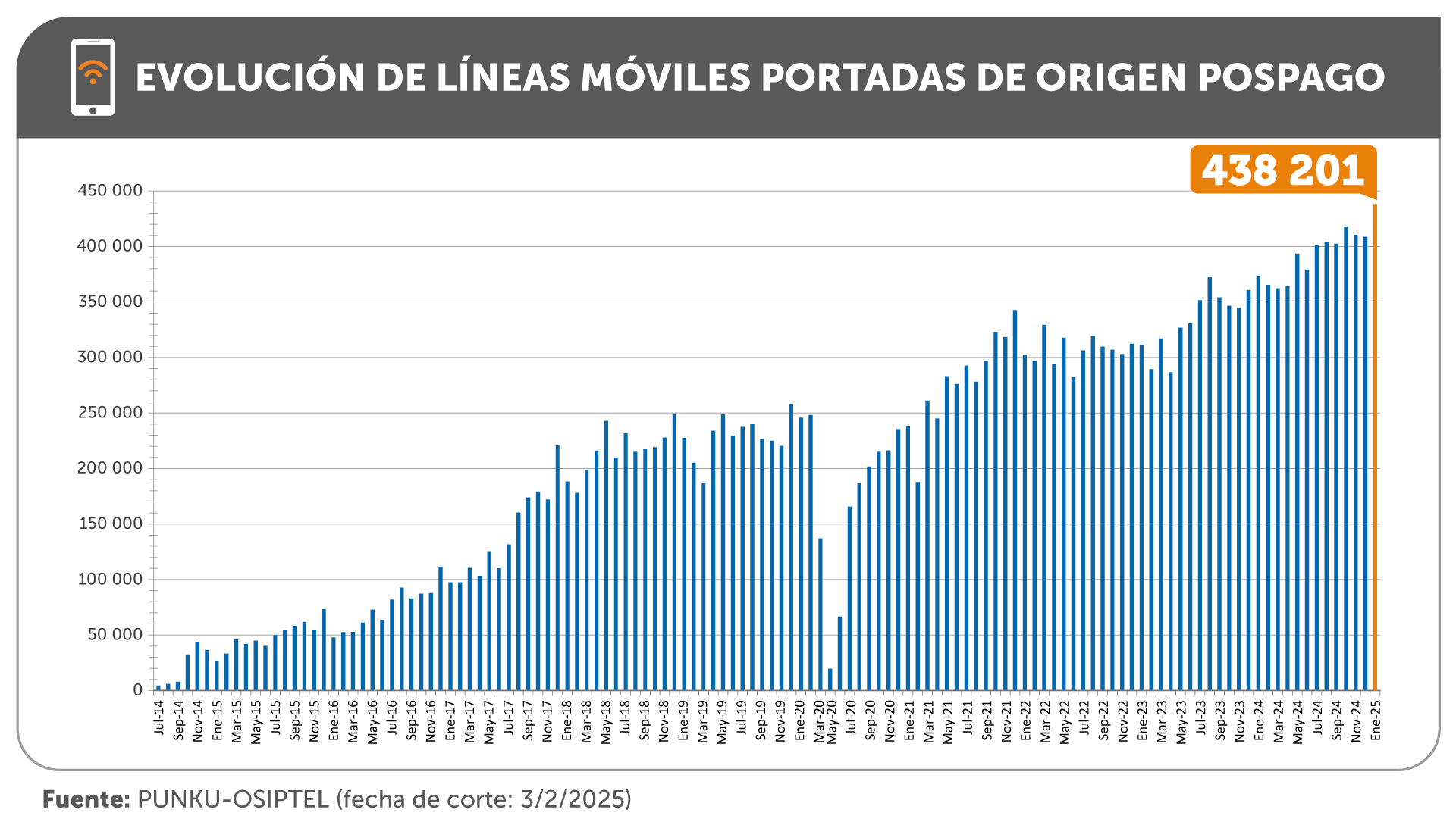 De acuerdo a la información publicada en la herramienta digital PUNKU (https://punku.osiptel.gob.pe/) del OSIPTEL, el cambio de operador en líneas pospago alcanzó su pico histórico, al totalizar 438 201 portaciones de líneas móviles.