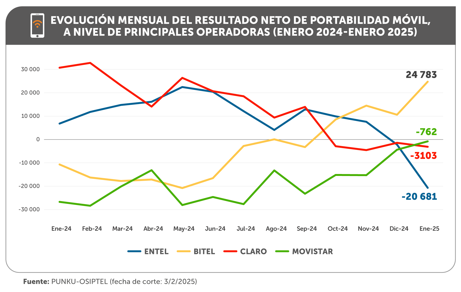 En enero, dos empresas operadoras alcanzaron resultados netos positivos, es decir, ganaron más líneas móviles de las que perdieron. Bitel, que cerró con saldo a favor de 24 783 líneas, y Guinea Mobile, que obtuvo un resultado neto positivo de 13 líneas.