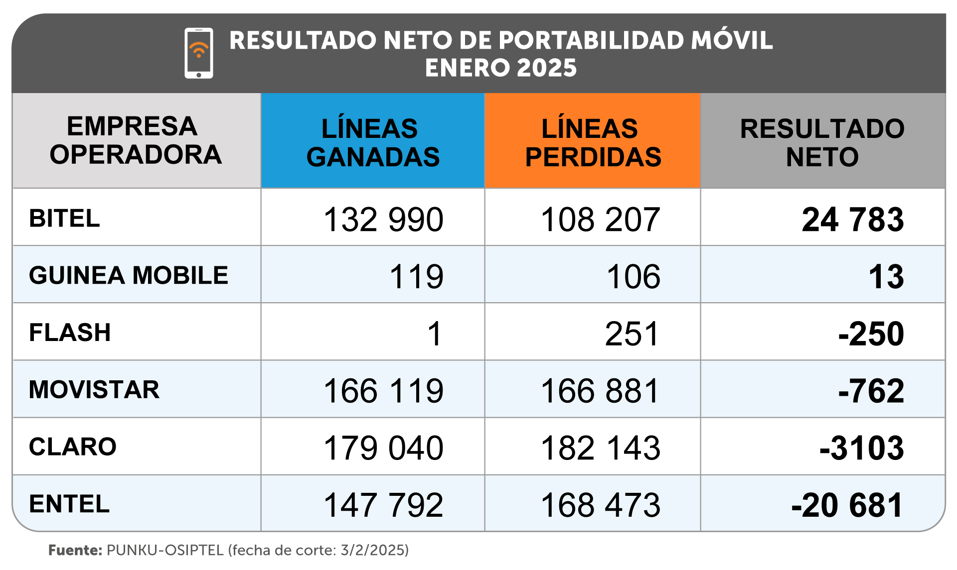 Por su parte, las operadoras Flash, Movistar, Claro y Entel tuvieron mayores pérdidas que ganancias en número de líneas, cerrando el mes con saldo negativo de 250, 762, 3103 y 20 681 líneas netas, respectivamente.