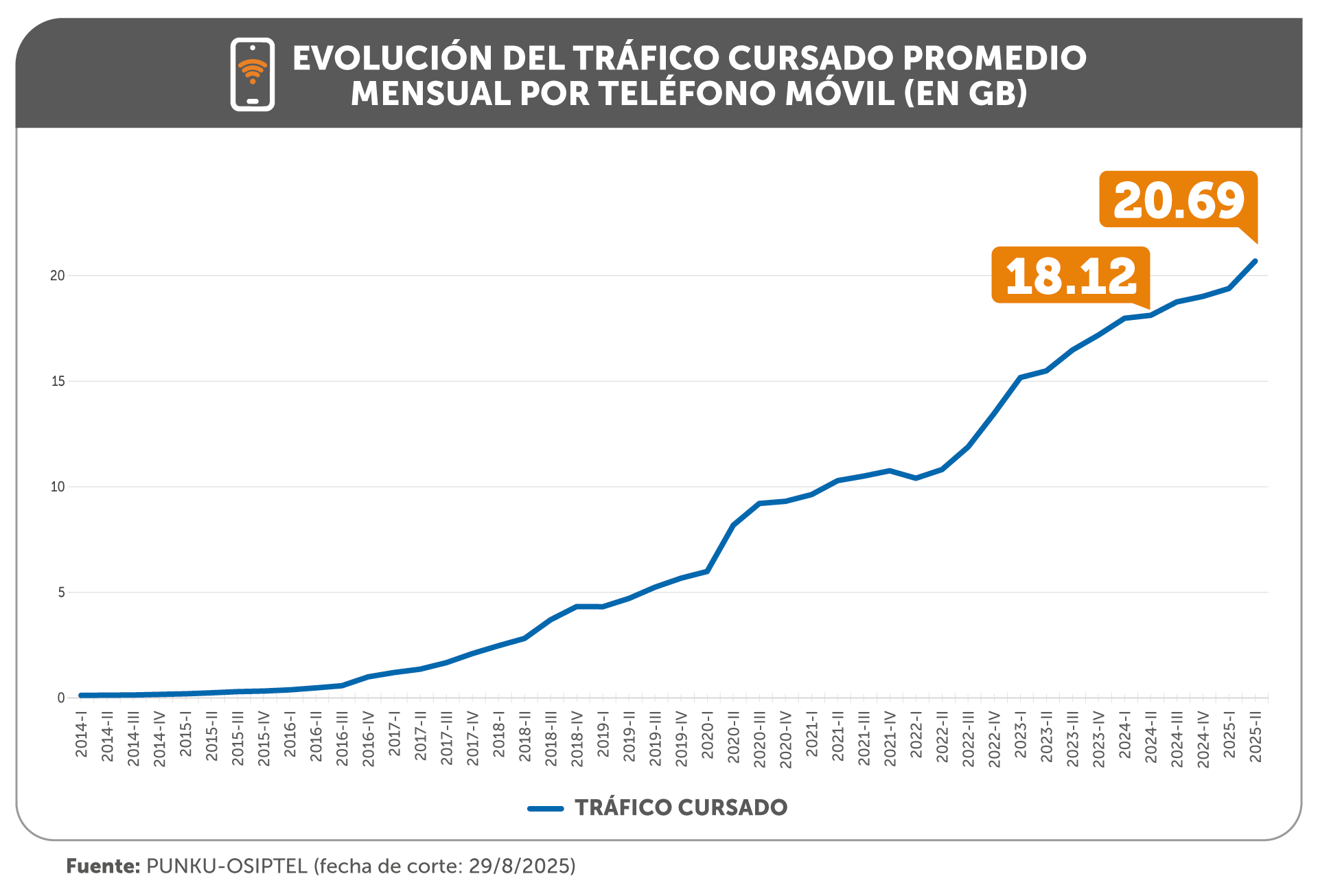 El acceso a internet móvil desde teléfonos móviles en el Perú continúa en ascenso. Al cierre del segundo trimestre de 2025, el consumo promedio mensual de datos de internet móvil desde teléfonos móviles se situó en 20.69 gigabytes (GB), lo que significó un avance de 14.18 % respecto al promedio de similar periodo de 2024 (18.12 GB), informó el Organismo Supervisor de Inversión Privada en Telecomunicaciones (OSIPTEL).