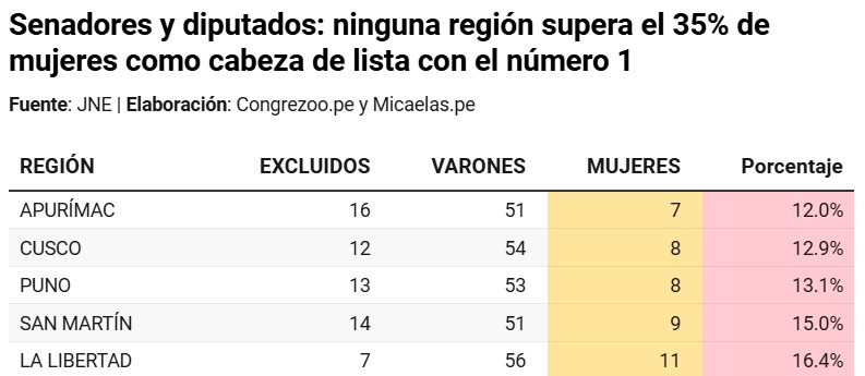 El reportaje multimedia publicado por Congrezoo revela que ninguna región supera el 35% de candidaturas femeninas con el número 1 para el Parlamento. Es decir, la situación es grave a nivel nacional, pero hay regiones que están incluso peor: tal es el caso de San Martín.